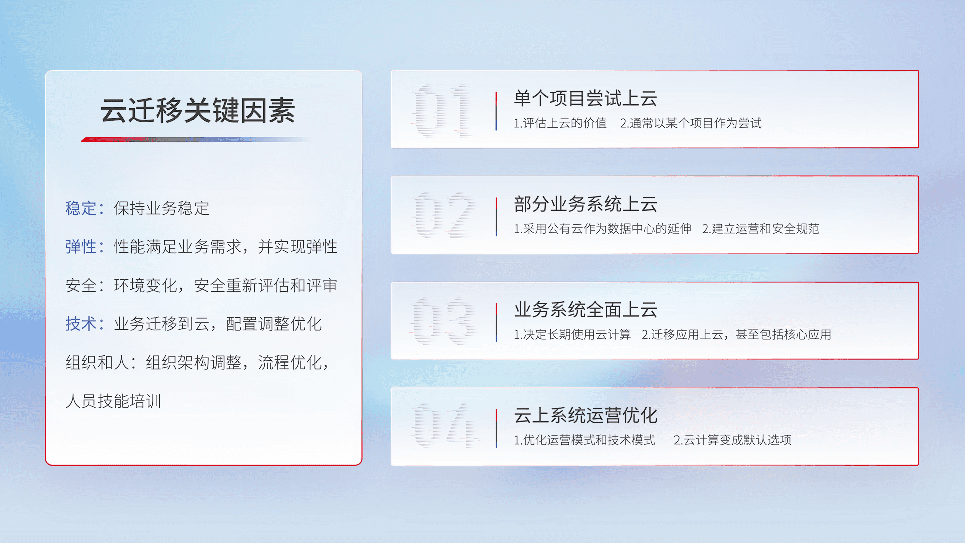 结合实际业务,,从规划设计、、云平台选型、、、、云原生改造、、、、数据迁移、、、、集成交付,,迁移全过程为客户识别最佳上云路径,,,,做好风险识别管理,,,,设计网络架构、、身份权限、、、、安全审计合规、、、操作审计、、日志审计、、、监控告警策略、、、多站点容灾设计等,,对云上基础设施进行整体规划,,,,提升IT治理水平,,,以满足弹性、、、、高可用、、、、高性能的需求。。。。