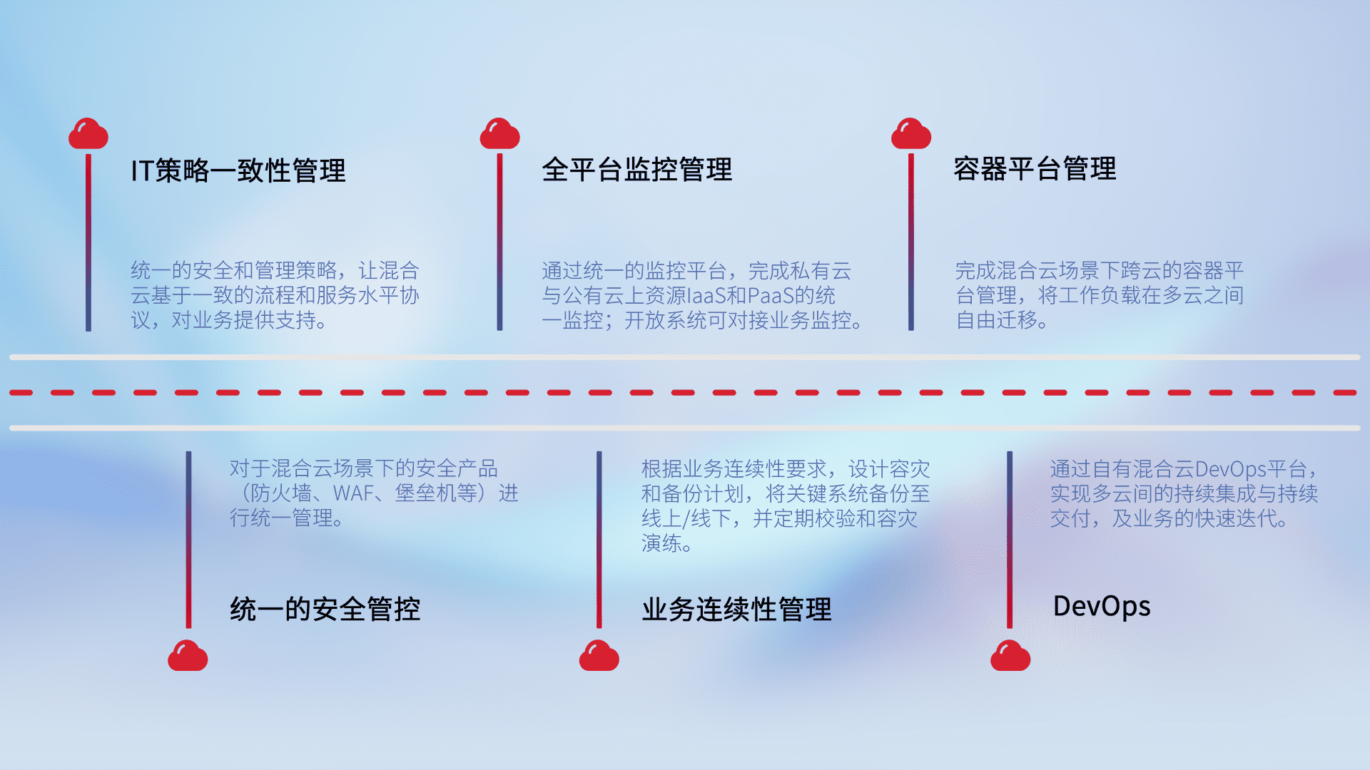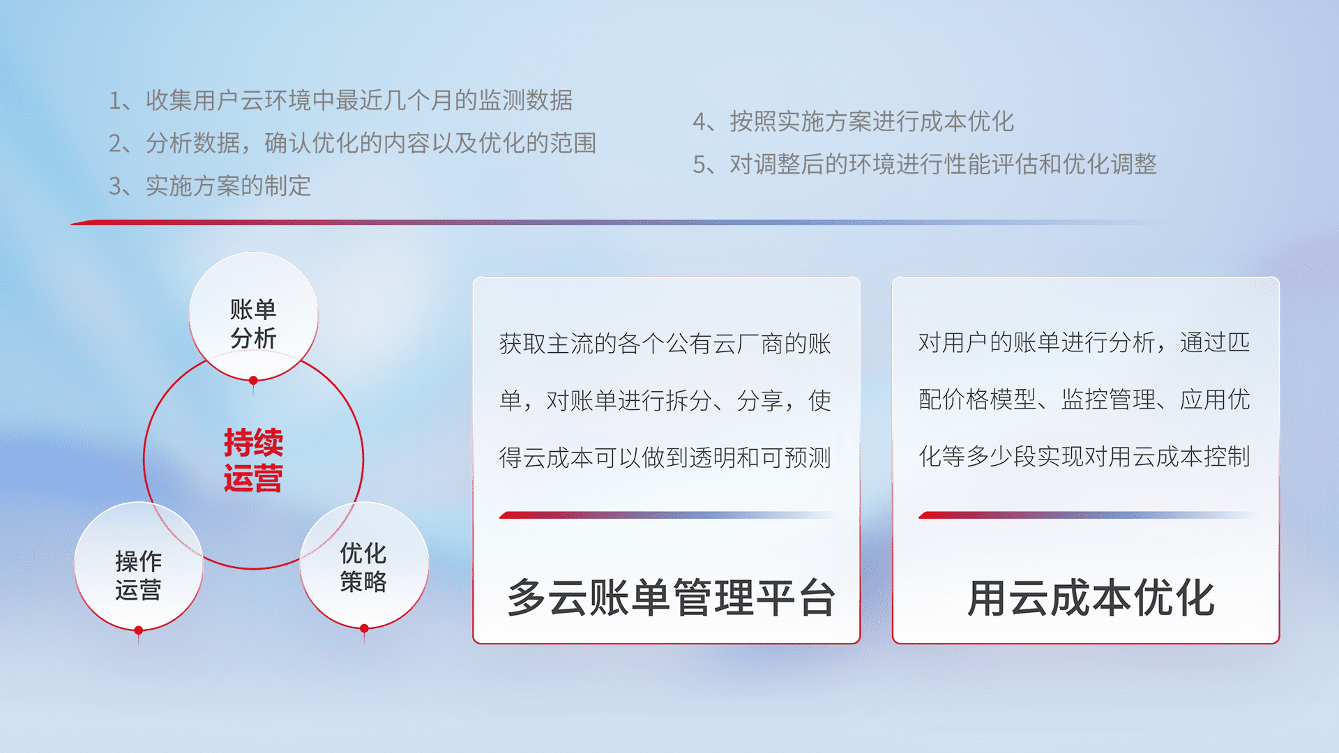 通过多云纳管,,以统一的资源数据模型把客户的云资源进行抽象和封装,,,,进而实现对多云资源的统一操作,,保障云资源管理的可靠性、、稳定性与可用性。。。。量身定制化运维内容,,,配置、、开发运维、、、、补丁管理、、、备份、、监控、、、、认证和访问管理、、审计和日常巡检等,,,,保障在用云过程中的可靠度,,稳定度以及高可用率。。。